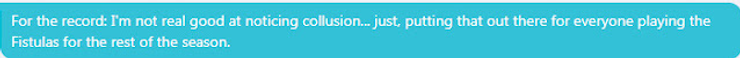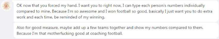 The highest point win, as projected, did go to The Fighting Fistula with 134.28 points. No one could have beaten him this week and he’s being really fucking gracious about it: