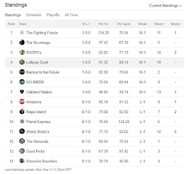 Due to the crazy-balls of the week, projections were a bit off. We had The Fighting Fistula, The Scumbags, RG3POs, Lollipop Guild, Backus to the Future, GO BIRDS, and Oakland Vaders coming out of this week with wins. The Amazons walk away with this week’s Bridesmaid award for the highest point loss at 86.14. That’s always a tough one. If she had played one of 8 other teams, she’d have a W. Lowest point loss and lowest point win goes out to this epic match-up: