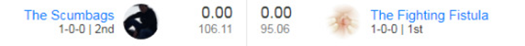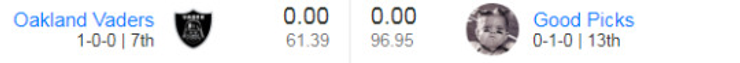 Planet Express, Shady Bradys, and Amazons are all currently favored this week in their match ups, but not everyone is done tweaking their lineups so don’t count Backus to the Future, Snoochie Boochies, and RG3POs out yet. This is a prime week for some really gross private team vs. team bets you will hope to never hear about… but they’ll probably tell us all anyway. Keep that Yahoo! chat away from the kids this weekend, folks.