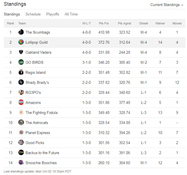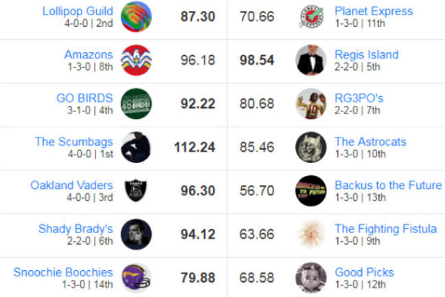 There’s been loads of complaints about injuries in our chat this season and this week is no exception, but regardless, we’re gonna have half of the teams win somehow. I am happy to report that as of this week, everyone officially has a win in the season. The other thing to report, which is kinda weird, is that half of the league has the exact same win/loss ratio. This week we have Snoochie Boochies, Shady Bradys, Oakland Vaders, The Scumbags, GO BIRDS, Amazons, and Lollipop Guild all cashing in on the “well someone had to win” card. Well except for The Scumbags who’s team actually seems to be doing well. Fuck that guy, amiright?