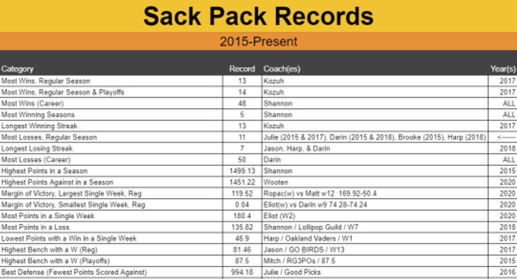The Sack Pack Record Book has been updated to hold more of our amazing accomplishments throughout our Sack Pack history. Sadly, some of our history is lost in time… or to be more accurate, lost in the NFL app since we switched from that to Yahoo for 2017. Some information from our 2015 & 2016 season were recorded in our awards and season areas, but other record information simply wasn’t tracked during that time. At the time of this posting, the NFL app isn’t live for the 2021 season so many of the options are still locked. The Commish will try again later in the year to see if our history can be accessed and our records can be made more complete.