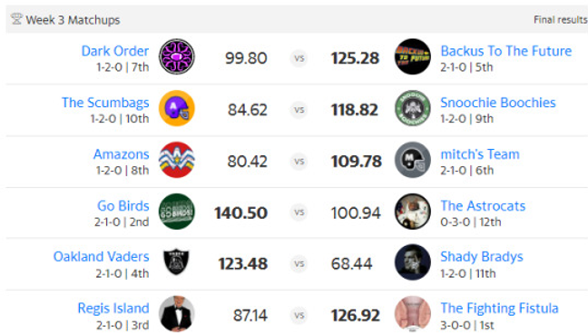 This week, our two remaining undefeated teams went head to head, and when the dust settled, only The Fighting Fistula retains the title. Grats to The Fighting Fistula on their win, and also to our other champs this week: Backus to the Future, Snoochie Boochies, mitch’s Team, Go Birds, and Oakland Vaders.