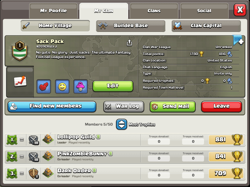 Once your clan castle is rebuilt, search for “Sack Pack” with the clan ID #2G9CRVLYJ in the game. After you’ve found us, request to join, and just shoot me a quick text or use the Yahoo league chat to let me know it’s you. We want to ensure that our Clash of Clans clan remains a haven exclusively for our league members.
