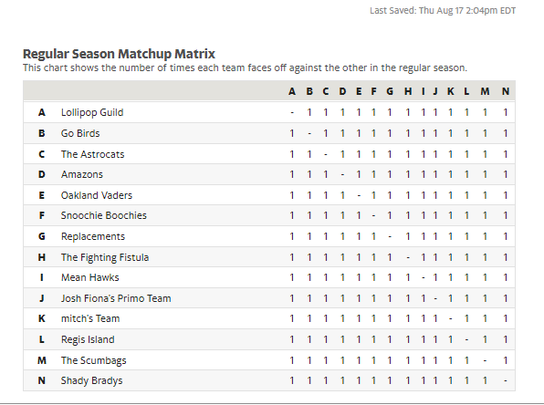 Our league has reached a new level of intensity with the finalization of our teams. Each coach has their eyes set on the coveted championship, and they’re planning a draft that will prove it. From the Astrocats to the Mean Hawks, the Amazons to the Scumbags – every team is brimming with potential and eager to claim their place in fantasy football glory. The schedule is set and each team plays each other exactly one time during our regular season.