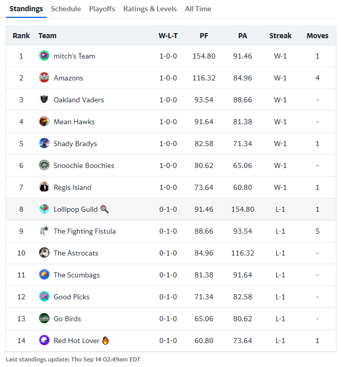 Now, here’s where it gets interesting. With the exception of two teams, most of us fell short of our prediction scores in Week 1. It seems like some active adjustments might be needed by our coaches to stay competitive in Week 2. So, get those trade offers brewing, tinker with your lineups, and let’s step up our game!