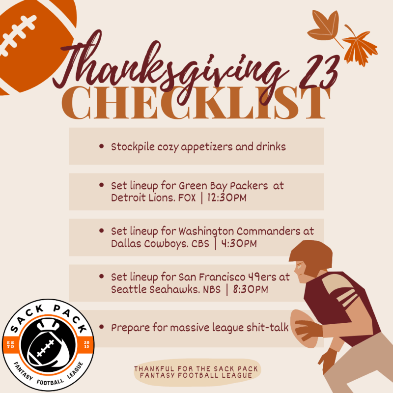 As we savor mouthwatering Thanksgiving delicacies, let’s relish the excitement of the games that await us on this special day. Set your lineups, cheer for your players, and revel in the joy of friendly competition. But above all, let’s remember to be grateful for the incredible members of the Sack Pack Fantasy Football League who make this journey unforgettable.
